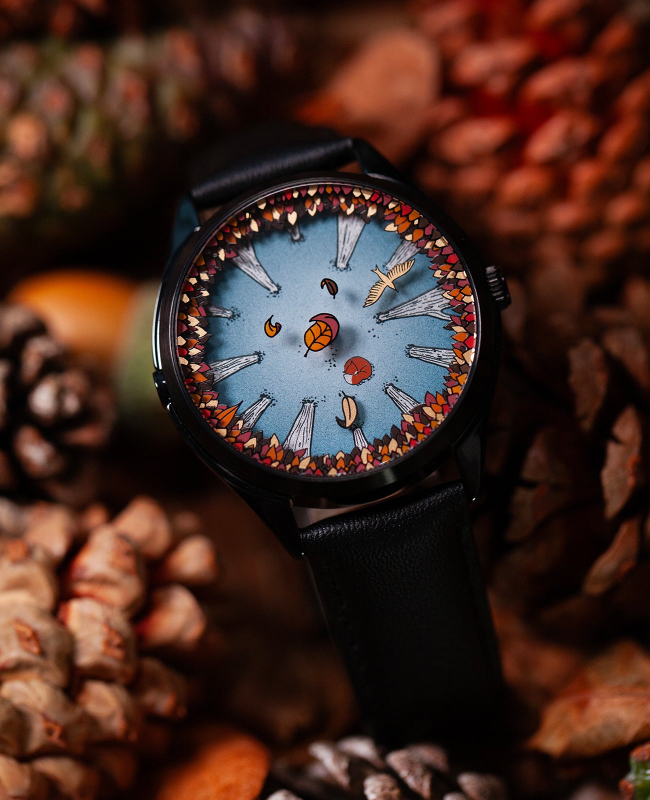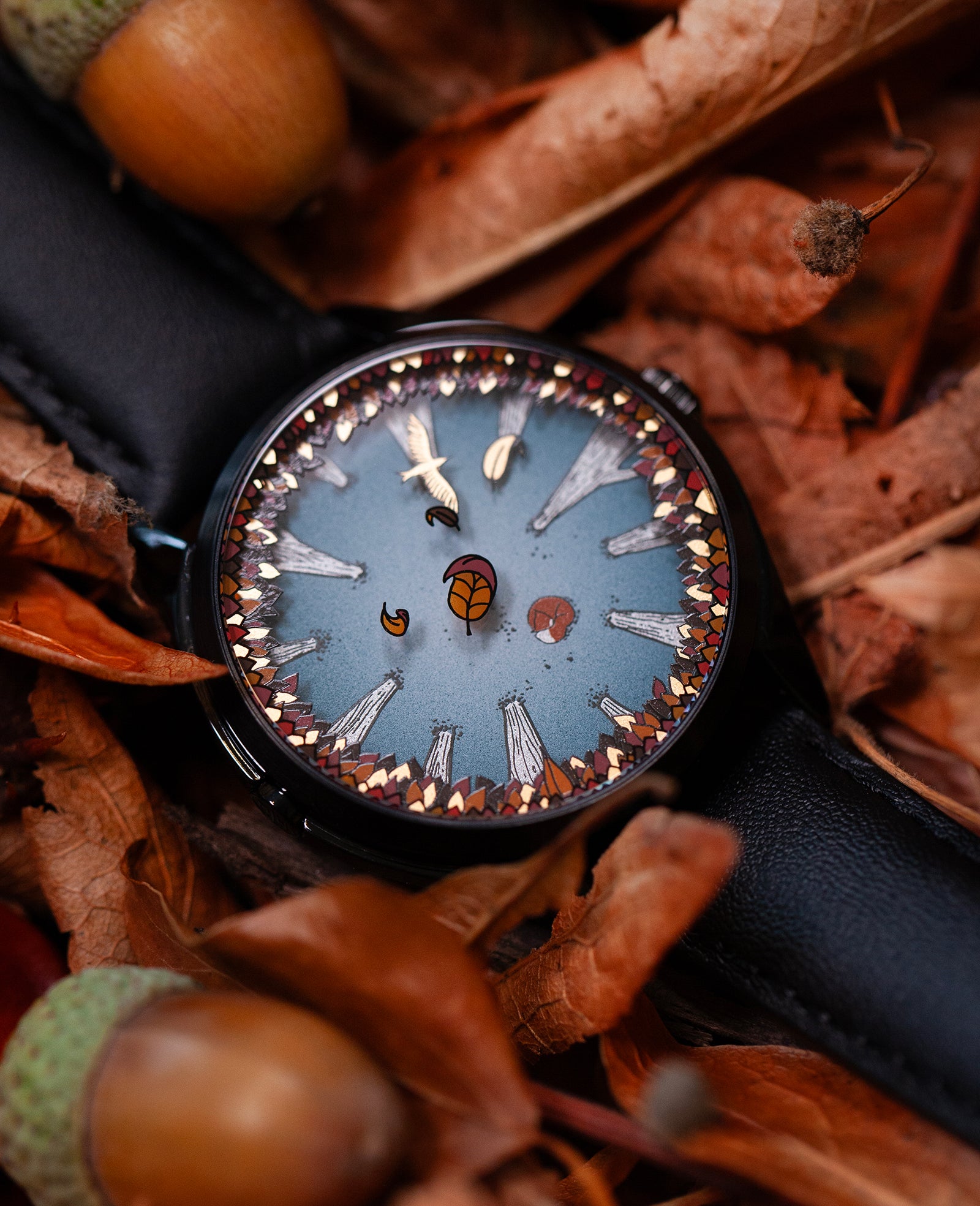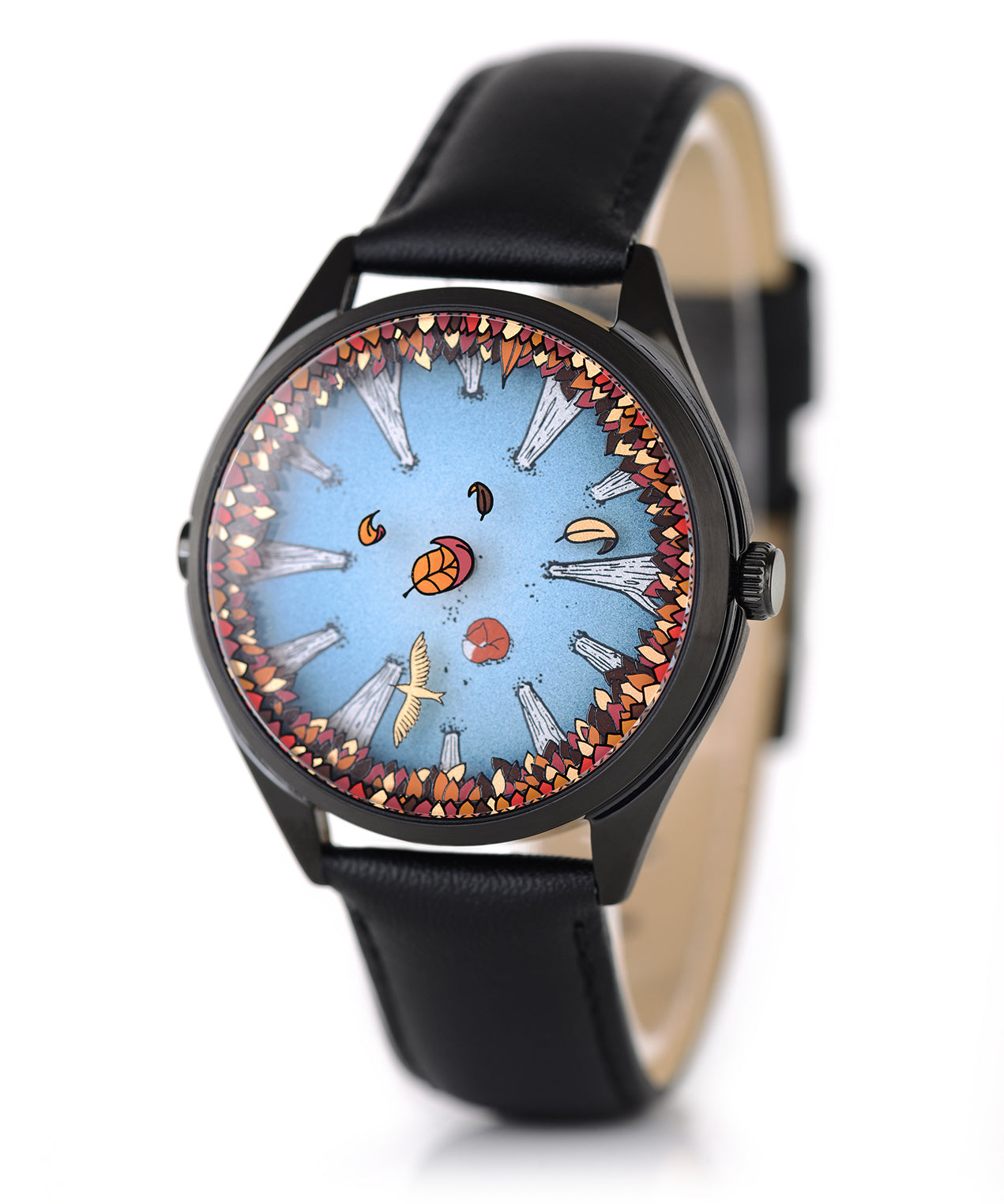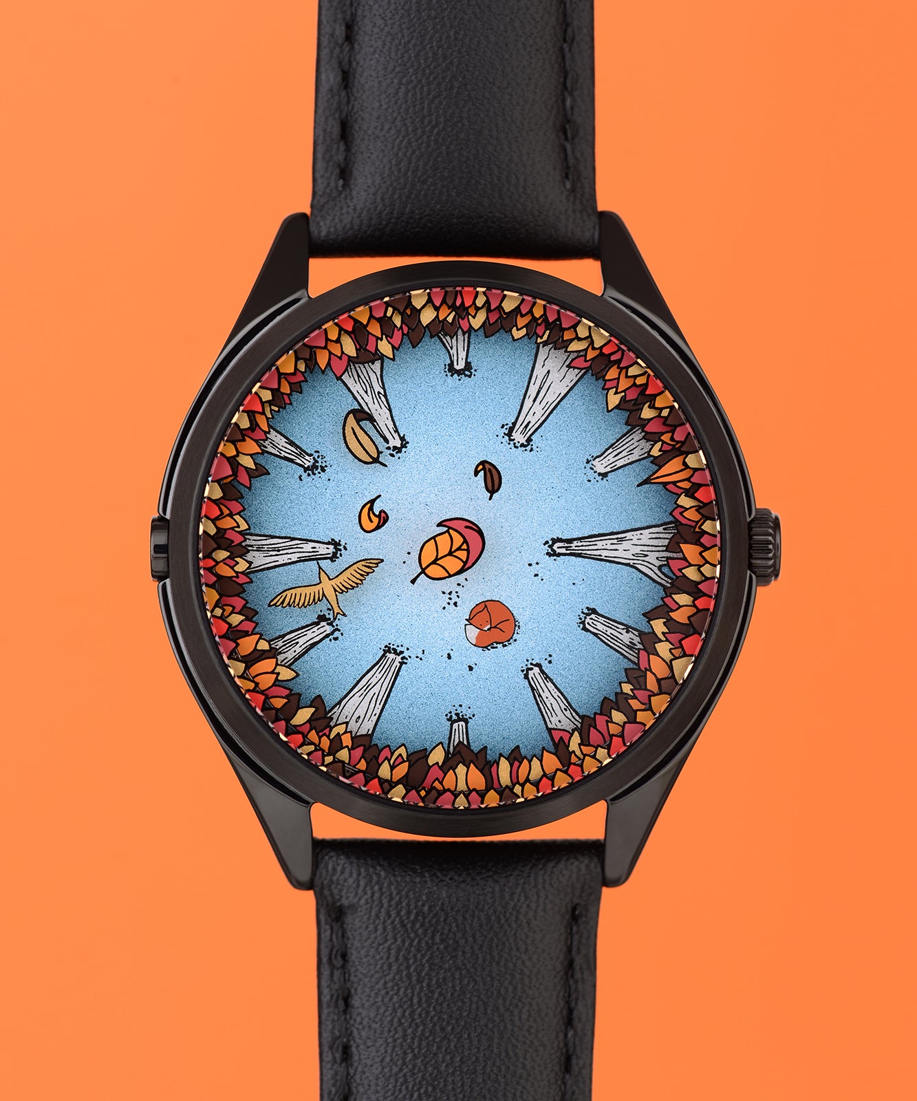 The tree trunks around the outside of the dial are positioned exactly where you'd expect to see numbers on a watch face, to help you read the time with precision.