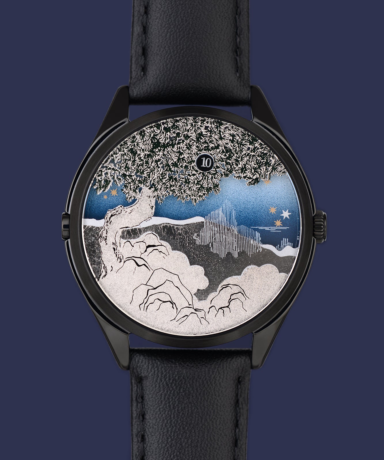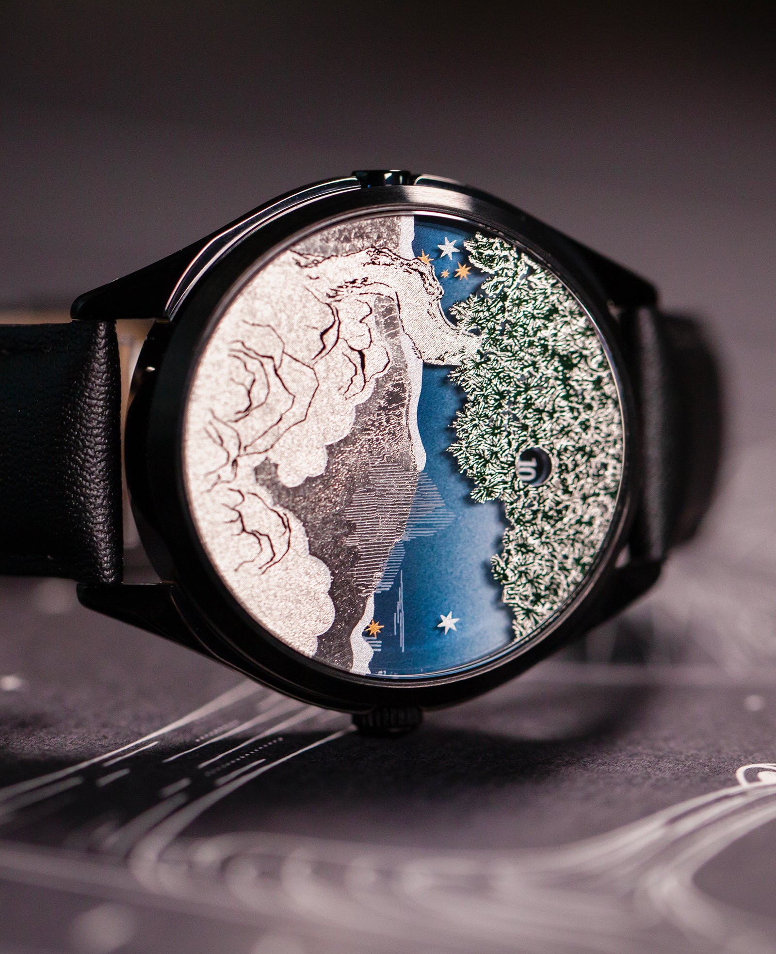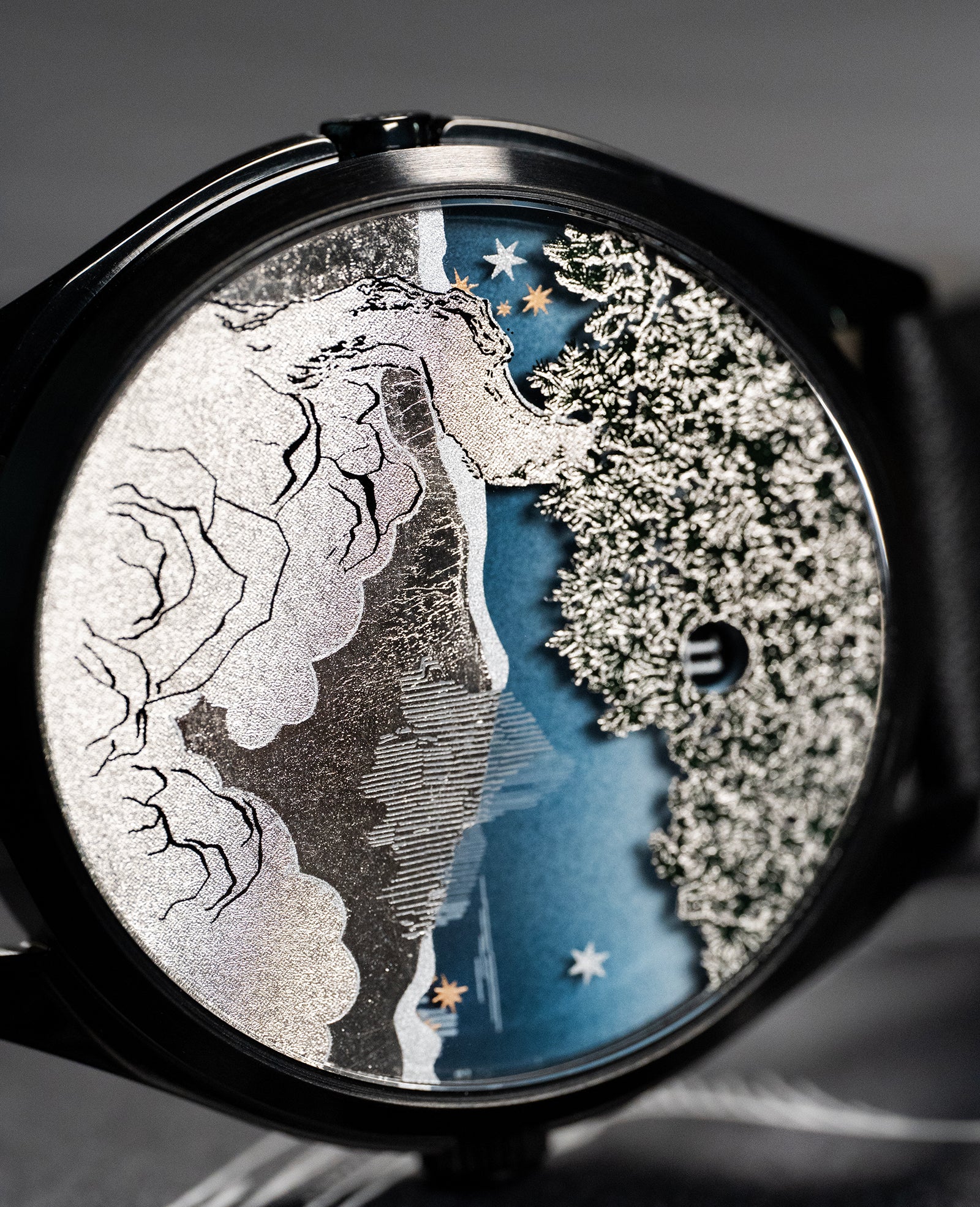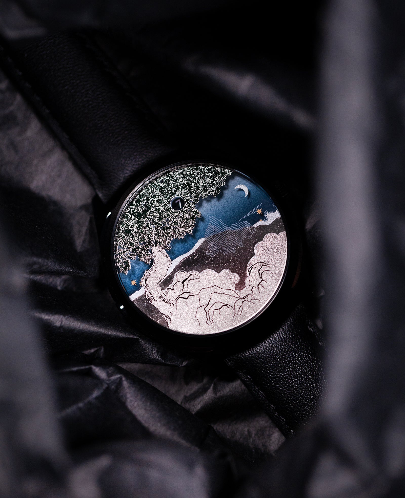 On the face of the watch a mountain shimmers on the horizon, appearing both near enough to touch and also impossibly beyond our grasp.