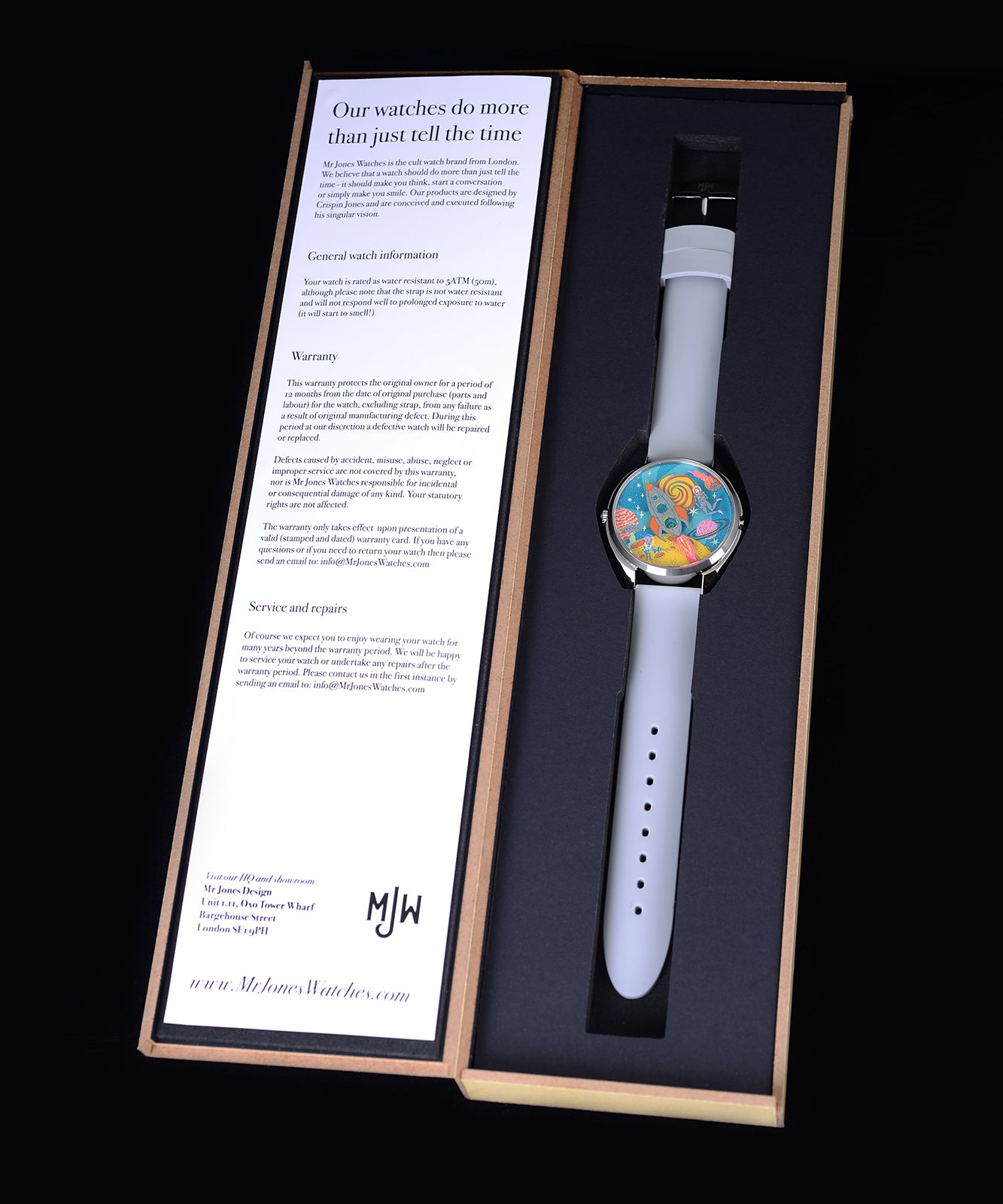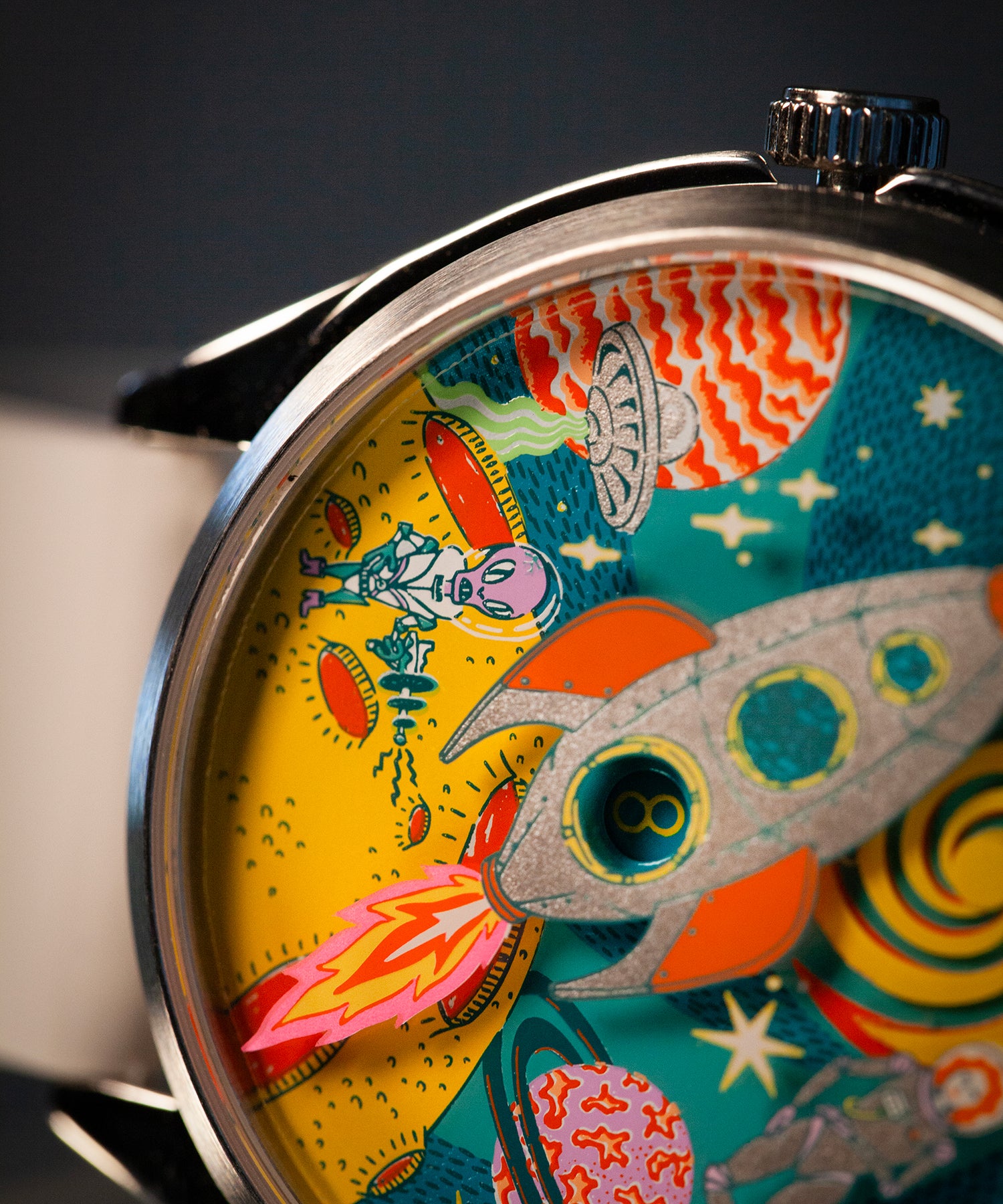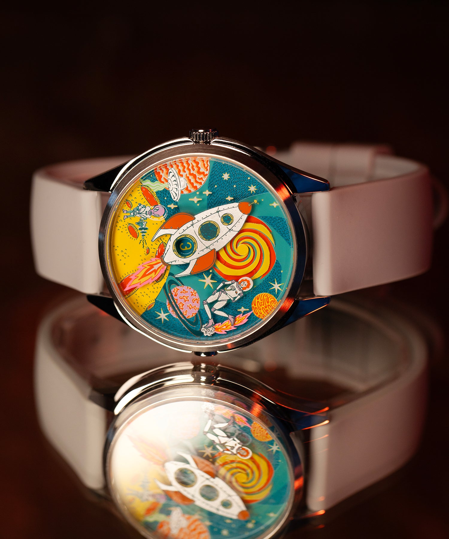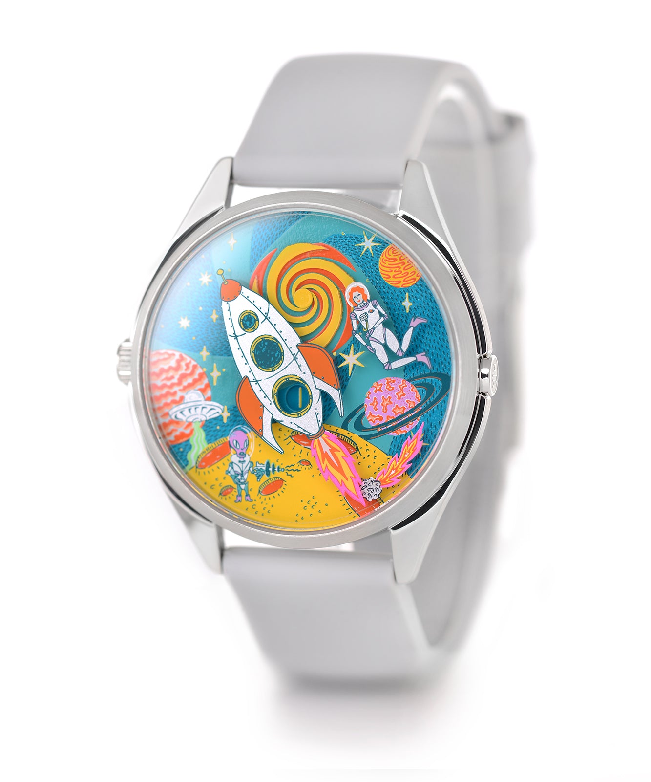 The bold, colourful space scene is capped off with a swirling, shifting vortex that creates a mini kaleidoscope of colour at the top of the dial.