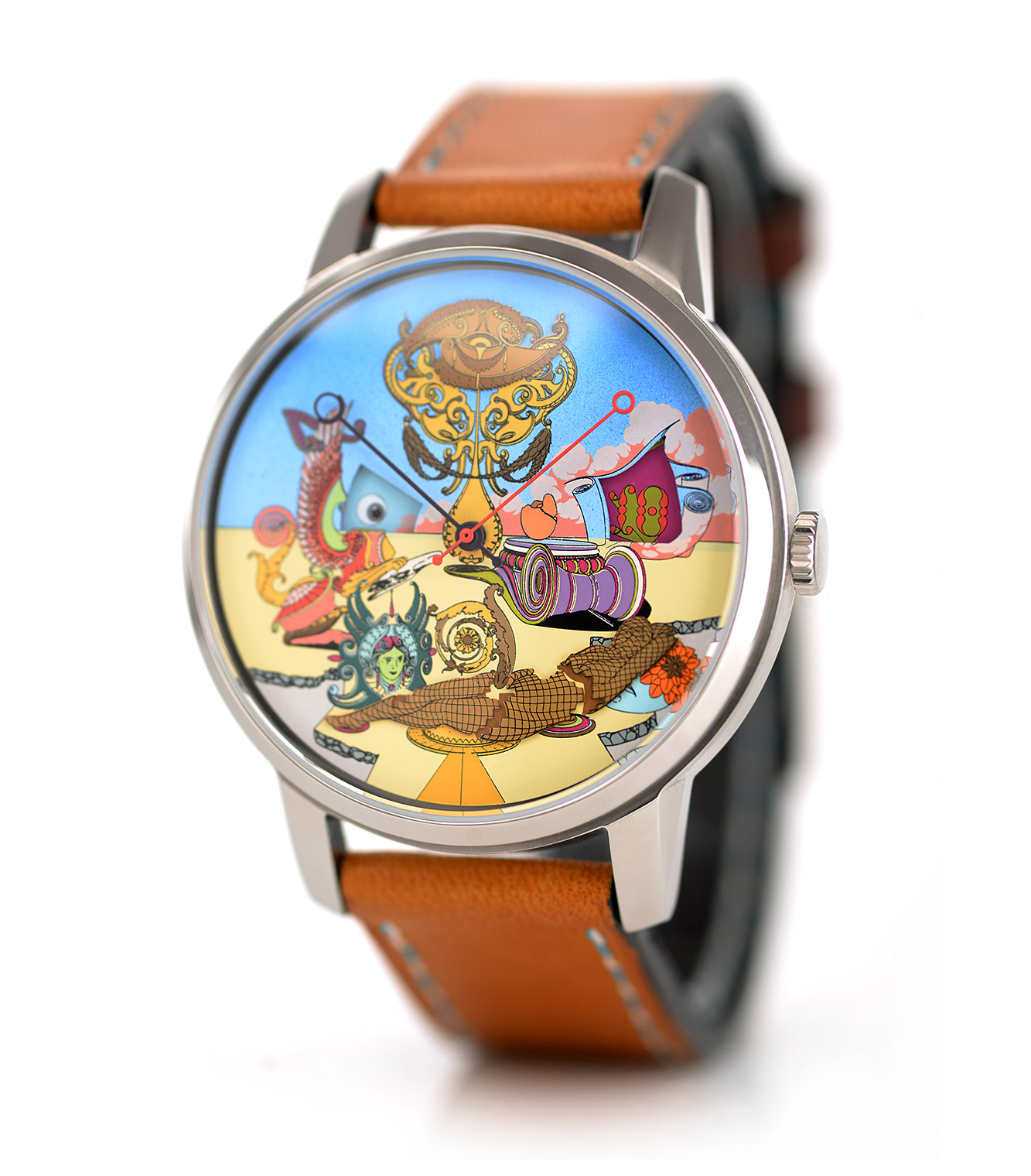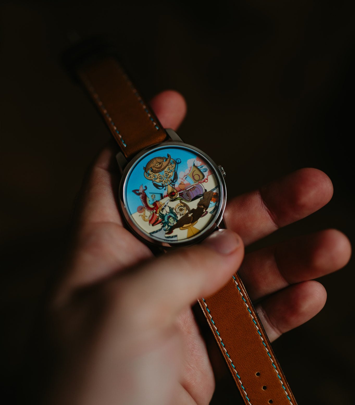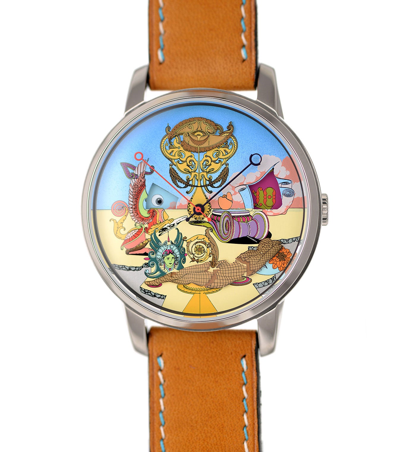 The minute and seconds hands work in the usual way, subtle design cues within the artwork act as markers for reading the position of the hands.
