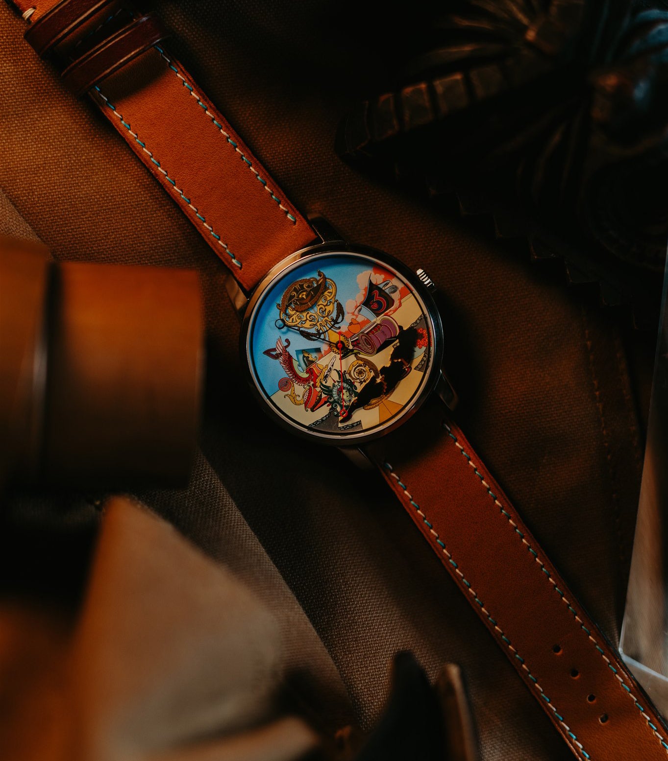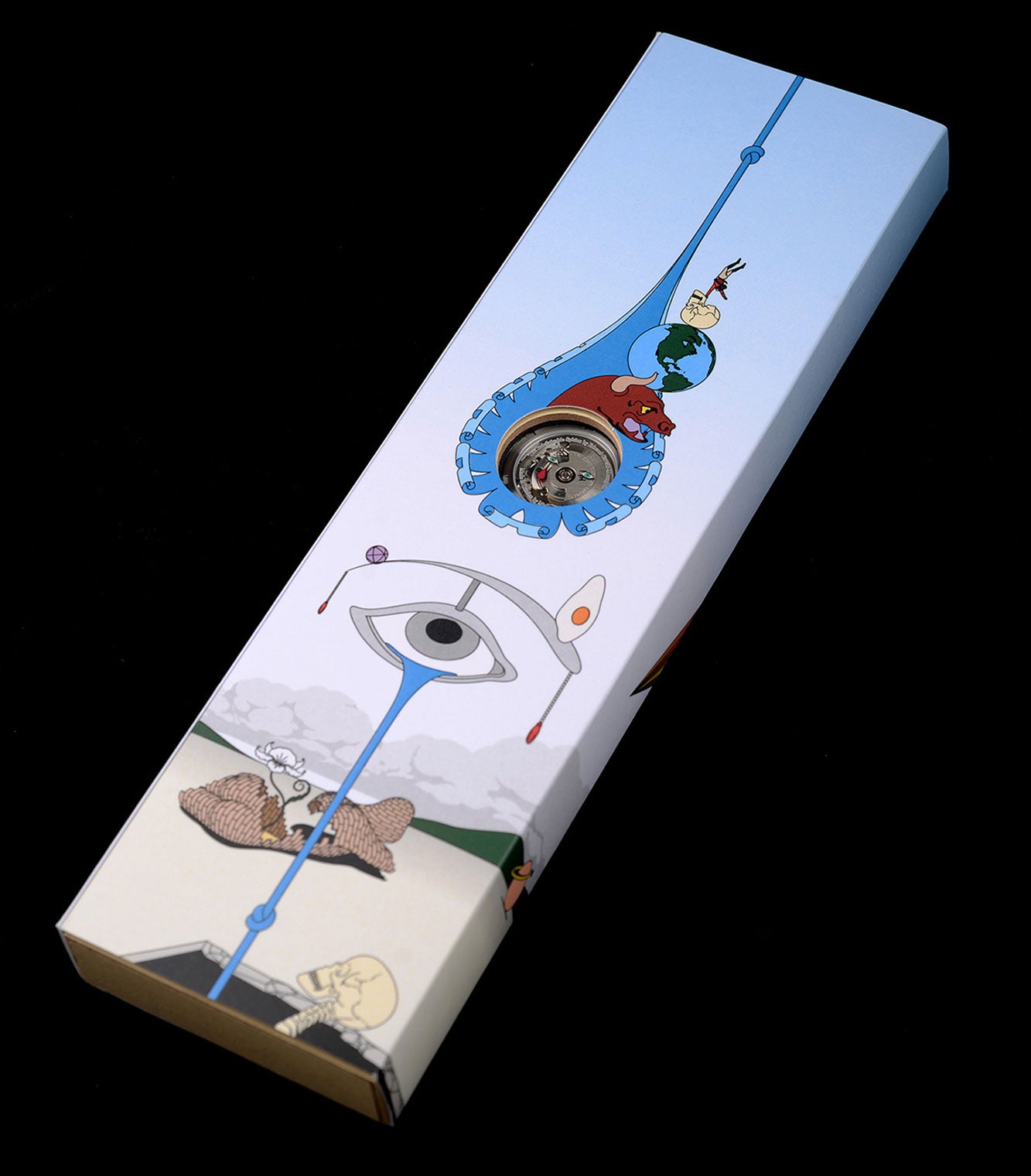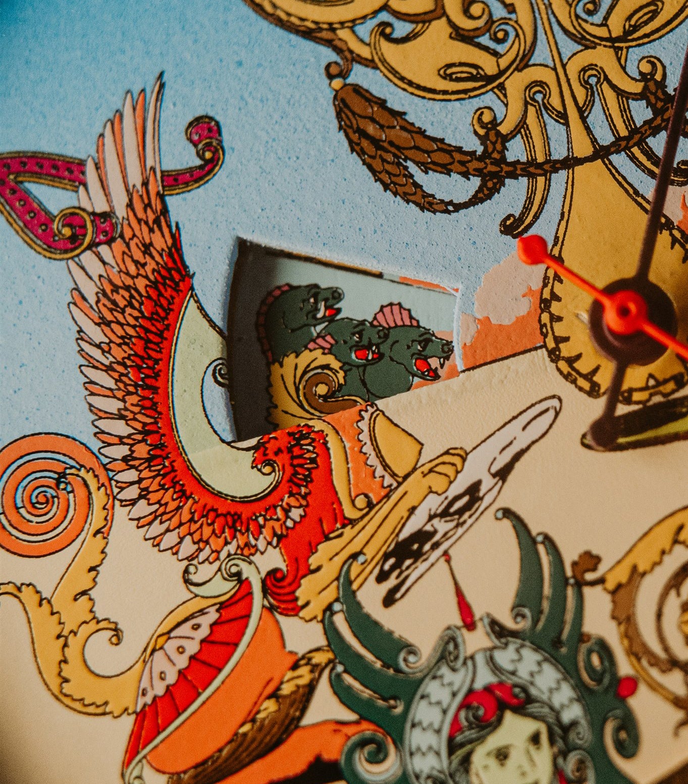 The minute and seconds hands work in the usual way, subtle design cues within the artwork act as markers for reading the position of the hands.
